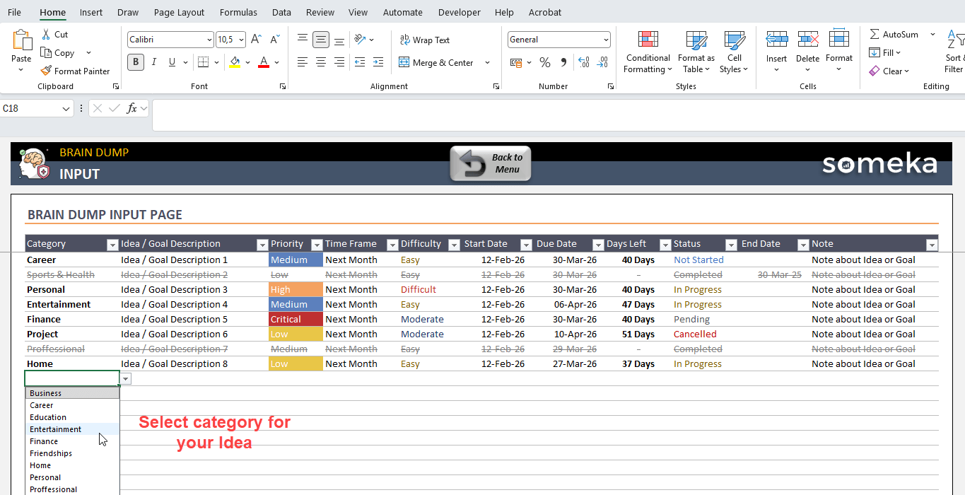 First, you’ll start by selecting your category for brain dump excel template and then you’ll add your idea description, select priority, time frame as well as difficulty.