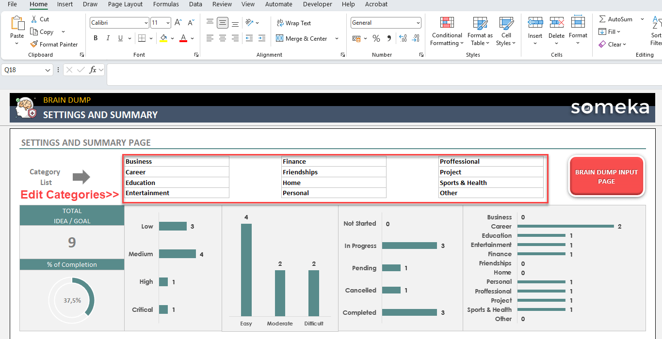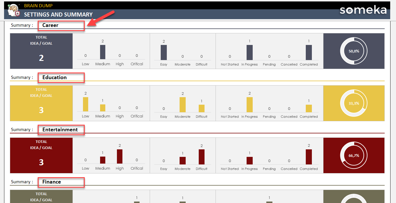On the Brain Dump Excel Template Summary page, you’ll first find an overall dashboard for all your ideas.