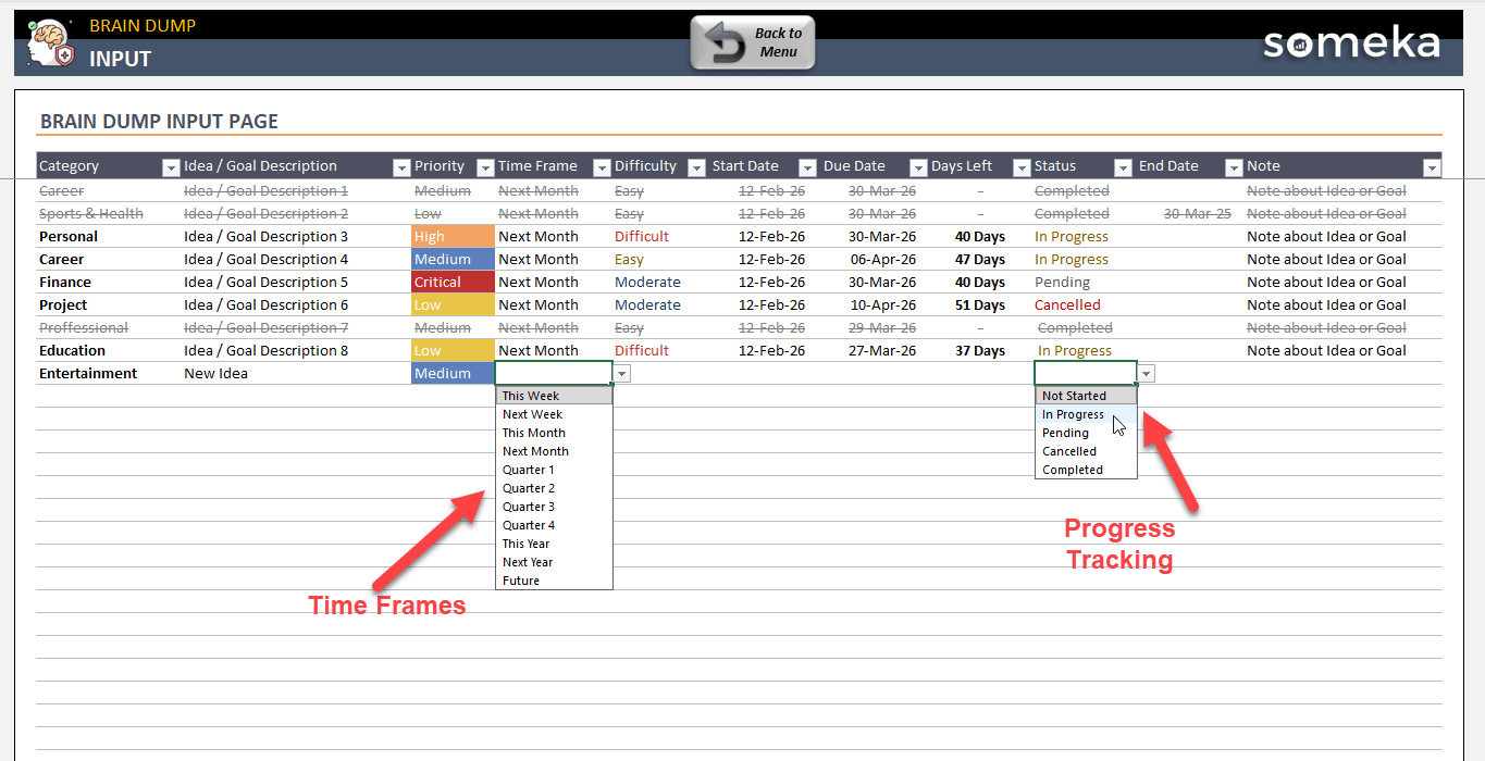 So this two-page Excel spreadsheet will boost your productivity in a simple way. You can quickly record your ideas/goals, assign categories, set priorities, difficulty levels, deadlines, and track statuses.