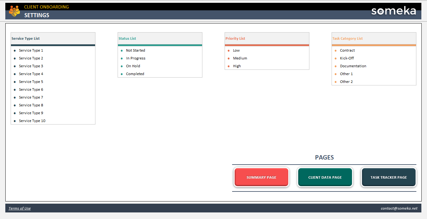 Also, on the menu sheet, you’ll find navigation buttons for the other pages of the Client Onboarding Excel Template.