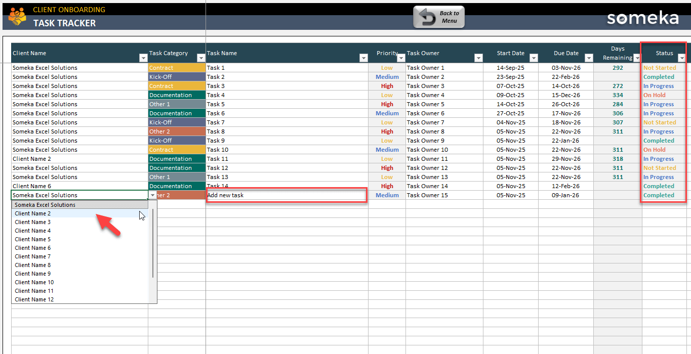 Firstly, select the customer from dropdown menu and add your tasks with relevant categories. Then, define the priority and the task owner. Afterwards, you will add start date and due day for each task. So, the template will automatically calculate the Remaining Day number for each tasks. Furthermore, you may track the Status of your tasks with dropdown menus: