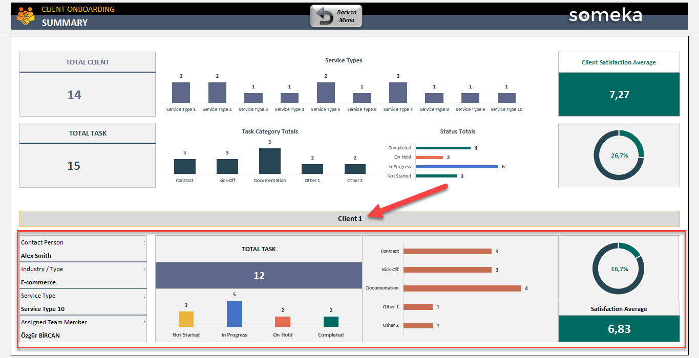 On the second section of your client onboarding excel template dashboard, you’ll find a client-based summary. Just select the client from the list and all relevant information will automatically populate: