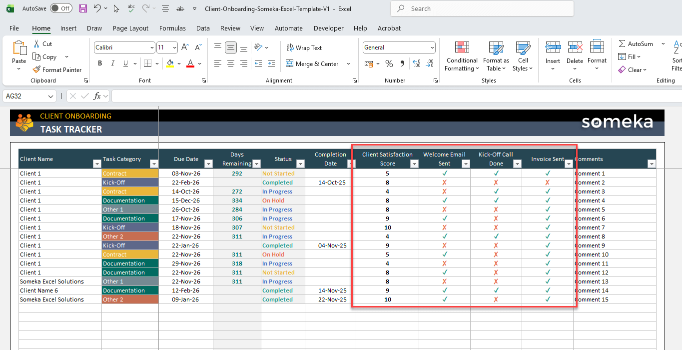 Again, on the Task Tracker you’ll have onboarding checklists for Welcome Emails, Kick-off calls, and Invoice sending actions. You may also add Client Satisfaction score to assess your client onboarding activities.
