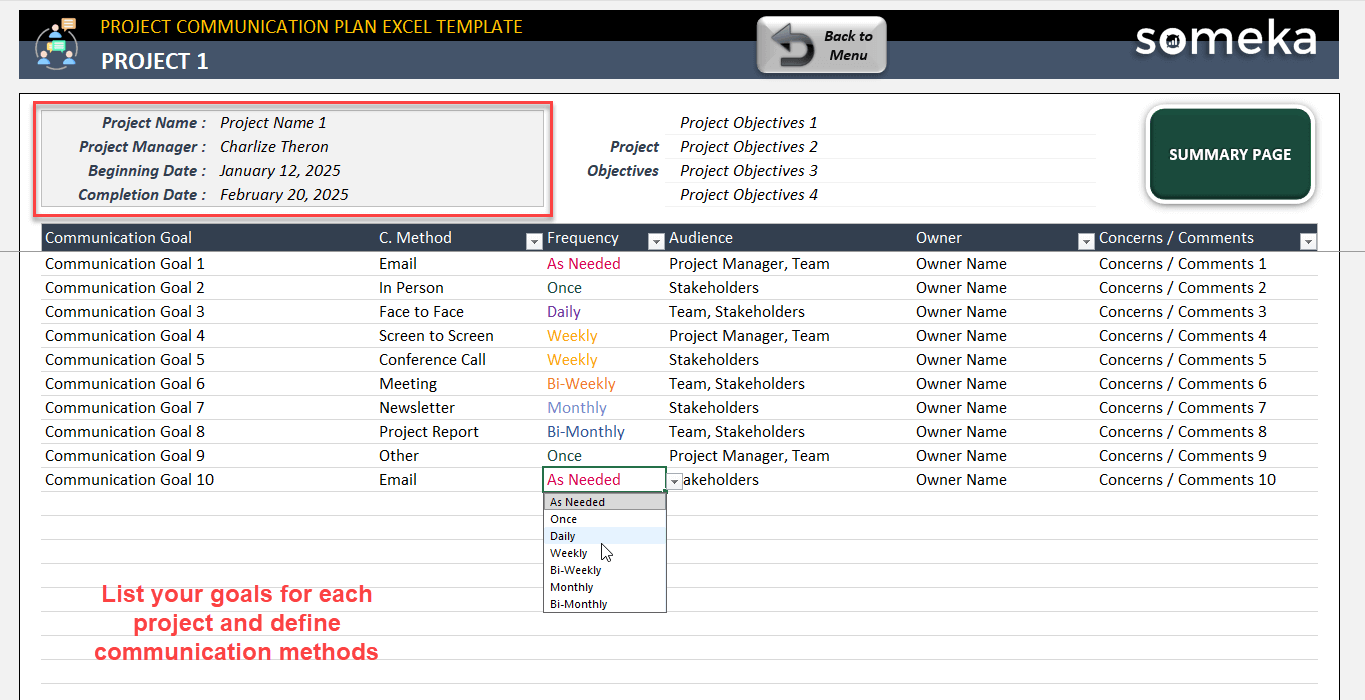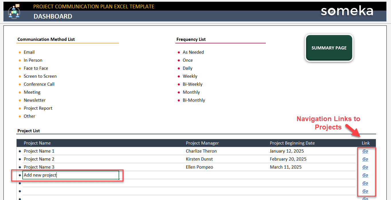 Yes, Someka’s Communication Plan Excel Template supports up to 10 projects. Each project will have a different sheet tab, and you’ll be able to see the entire numbers on the Summary.