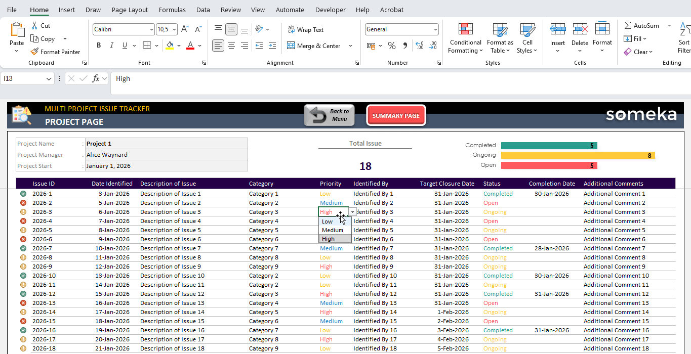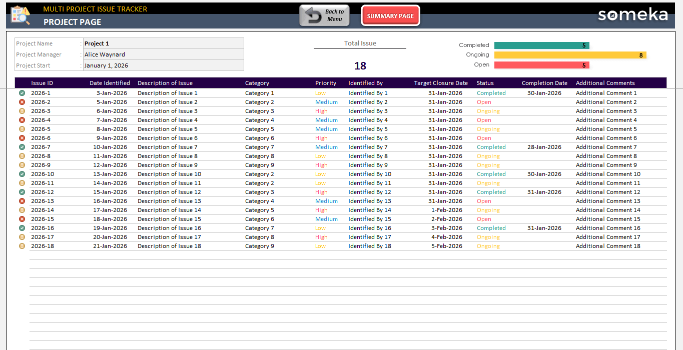 Multiple Project Issue Tracker Excel Template Features Summary: