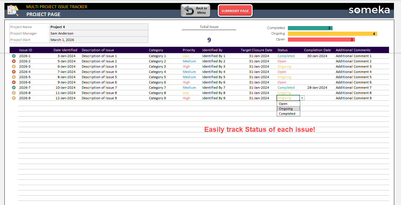 Then, you can add tracking data for each issue, which will include the Target Closure Date, Status, Completion Date, and additional comments. Also, feel free to update the Status of each issue once it’s done.