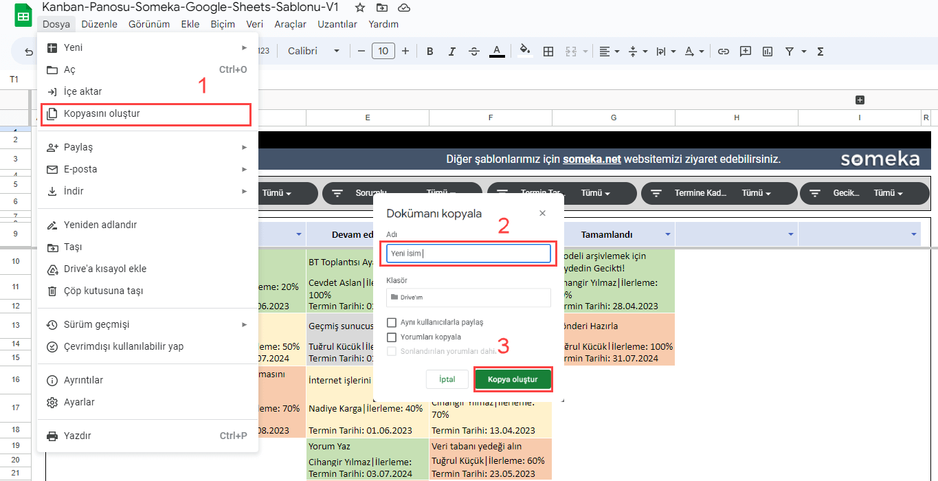 Google E-Tablolar Kanban Panosu şablonu. Dinamik kanban kartları ile efektif bir proje yönetimi sağlayın. Kurulum gerektirmez. Tüm cihazlarınızdan online erişebilirsiniz.